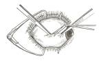 Параллельно верхнему краю лимба и отступя от него 5-6 мм делают разрез конъюнктивы и влагалища глазного яблока длиной 12-15 мм. Под верхнюю прямую мышцу подводят крючок. Ее либо пересекают, предварительно наложив по краям два шва для последующего прикрепления к прежнему месту, либо отводят в сторону и удерживают в этом положении. Конъюнктиву и влагалище глазного яблока тупым путем широко освобождают от склеры. С помощью фиксационного пинцета или шва, наложенного на сухожильную полоску, оставшуюся после пересечения верхней прямой мышцы, глазное яблоко поворачивают книзу и кнутри. Если мышцу не пересекали, то тракционный шов накладывают на эписклеру у верхнего края лимба.